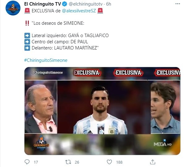 “Las tres posiciones que quiere reforzar Diego Pablo Simeone son el lateral izquierdo, el centro del campo y la delantera. Tiene a dos nombres por banda, José Luis Gaya del Valencia y Nicolas Tagliafico. Ven más fácil la llegada del argentino ahora mismo. Ajax ha prometido que le dejará salir y si bien tiene ofertas, no costaría más de 20 millones. Rodrigo De Paul y su situación va a depender de Saúl sí o sí. En la delantera es verdad que no tienen nombres claros, pero sueñan con Lautaro Martínez aunque saben que es difícil por su alto precio”, finalizaban en el Chiringuito.