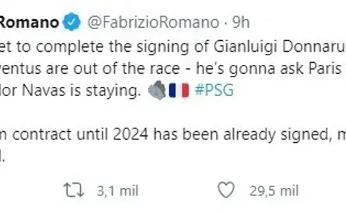 Fabrizio Romano aseguró que tras varias conversaciones con el equipo de Joan Laporta y Juventus de Turín, ha sido Al-Khelaifi el único capaz de llevarse al jugador: “El PSG está listo para completar el fichaje de Gianluigi Donnarumma en las próximas horas, la Juventus está fuera de carrera: le pedirá a París la camiseta n99. Para ser claros: Keylor Navas se queda”.
