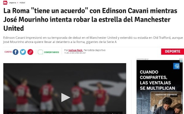 “Según los informes, José Mourinho quiere llevar a la estrella del Manchester United Edinson Cavani a la Roma este verano, con un acuerdo supuestamente vigente. Cavani impresionó en su temporada de debut en el United y extendió su estadía en Old Trafford un año más”, afirma Daily Star sobre el pedido del portugués a la dirigencia de los capitalinos.