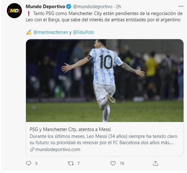 PSG y Manchester City, únicos equipos capaces ahora mismo de apostar con toda por el fichaje y sueldo de Lionel, serían según el medio los clubes que le han dicho a Messi que están al tanto de su situación y que en caso de que las negociaciones con Barcelona no lleguen a buen puerto, estarán encantados de recibirle.