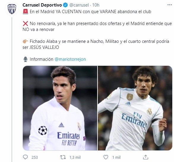 Desde la CADENA SER en España marcan que al igual que ocurre con el capitán, Florentino empieza a planear la temporada sin el francés: “En el Madrid ya cuentan con que Varane abandona el club. No renovaría, ya le han presentado dos ofertas y el Madrid entiende que no va a renovar. Fichado Alaba y manteniendo a Nacho, Militao y el cuarto central podría ser Jesús Vallejo”.