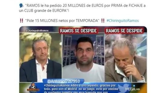 “Sergio Ramos ha hablado con varios clubes. Cómo prima de fichaje pide 20 millones, solo cómo prima de fichaje. No se si lo acepten. Por lo que tengo entendido ha pedido también dos años a 15 millones de euros netos por temporada. Es lo que tengo entendido. Se ha hecho una oferta desde un club importante de Europa. También habría una temporada opcional. Ramos ganaba 12 en Real Madrid”, afirmaba el presentador sobre los primeros pasos para ver al zaguero con otra camiseta.