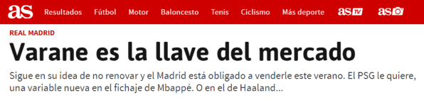 Según el portal especializado Transfermarkt, el defensor vale 70 millones de euros, por lo que una venta o un trueque podrían facilitar la compra de Mbappé, o en su defecto el de Erling Haaland, quien también está en el radar de Zinedine Zidane y compañía.