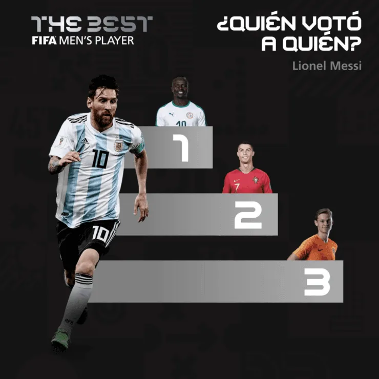 En tercer lugar, a Frenkie de Jong, quien se había convertido hacia semanas en su nuevo compañero del Barcelona. Segundo a Cristiano Ronaldo, su eterno rival. En primera instancia, Messi había sorprendido a todos: puso aSadio Mané.