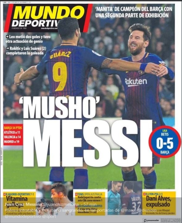 Lionel Messi marcó dos tantos en la goleada del Barcelona 5-0 ante el Betisy los jugadores e hinchas del equipo andaluz se rindieron ante la magia del crack argentino.