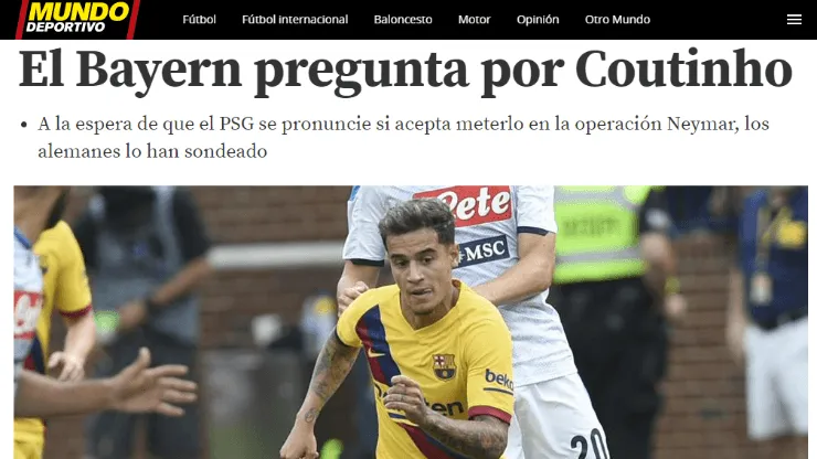 Si bien en un principio se especulaba que el PSGiba a ser el próximo hogar de Coutinho, Mundo Deportivo indicó que el Bayern Munich consultó en las últimas horas por Philippe.