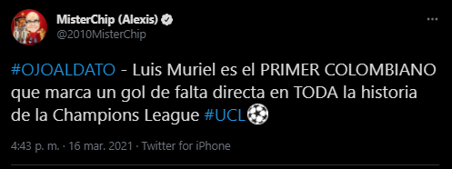 Y el que se encargó de darlo fue el popular analista de datos, MisterChip, quien después de la anotación de Muriel contra el Real Madrid, en su cuenta de Twitter publicó el dato y dijo: “Luis Muriel es el PRIMER COLOMBIANO que marca un gol de falta directa en TODA la historia de la Champions League”.