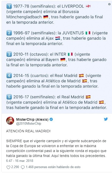 “Siempre que el vigente campeón y el vigente subcampeón de la Copa de Europa se volvieron a enfrentar en una máxima competición europea continental pasó a la siguiente ronda,el equipo que había ganado la última final. Aquí tienen todos los precedentes”, explicó.