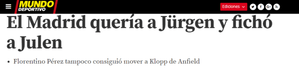 “Tampoco consiguieron moverle deAnfield. Visto hoy, parece un chiste. Pretender aJürgeny conformarte conJulen”, cerró le periódico español.