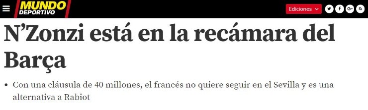 Según informó Mundo Deportivo, N’Zonzi, que actualmente tiene una cláusula de 40 millones, se habría convertido en el paso del tiempo como una alternativa para el Barcelona en caso que la transferencia deAdrien Rabiot, jugador del PSG, no termine en buen puerto.