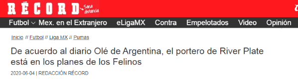 Lo que nadie fue venir es el supuesto interés que tendría Pumas de México por Franco Armani. La información la publicó Diario Olé. Todavía no hubo oferta formal, pero podría llegar en los próximos días. Hay que tener presente que la cláusula de rescisión del portero es de unos 20 millones de dólares.
