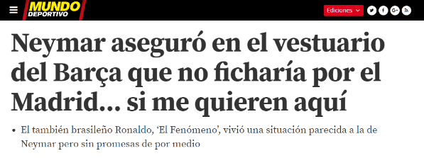 Bueno, según publicó hoy Mundo Deportivo, el delantero de la Selección Brasil le habría prometido al vestuario Culé que no sería jugador Merengue.