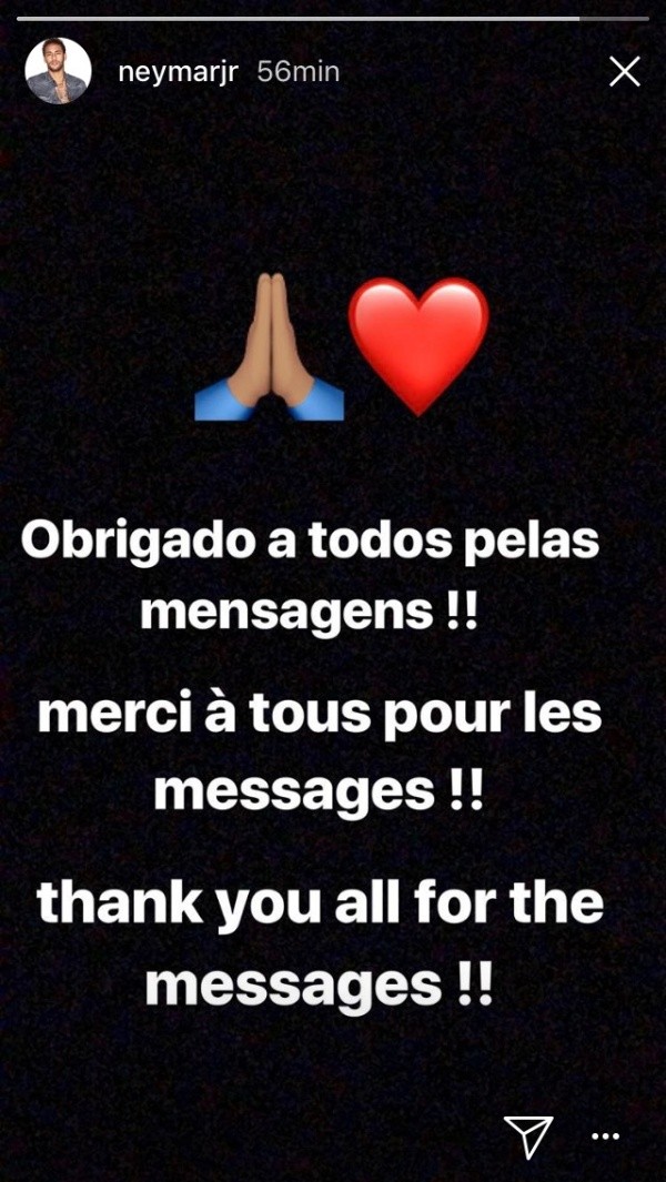 Neymar dejó una historia de Instagram en agradecimiento a los mensajes de apoyo que ha recibido desde que se conoció que tendrá que ser operado. También escribió un mensaje en su difícil momento.