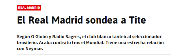 Según informaronO’Globoy Radio Sagres,Real Madridsondeo nada menos que a Tite, el seleccionador de Brasil para el Mundial de Rusia 2018.