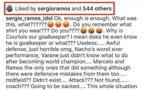 Es que el experimentado defensor de Real Madrid le dio “me gusta” a una publicación en Instagram que critica de manera despiadada a ThibautCourtois y también a toda la defensa del conjunto ‘Merengue’.