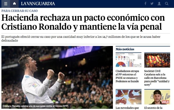La situación de Cristiano Ronaldo se complica tras el rechazo de la oferta del delantero portugués a la Hacienda de Madrid, informan el diario de Barcelona La Vanguardia y la agencia Europa Press.