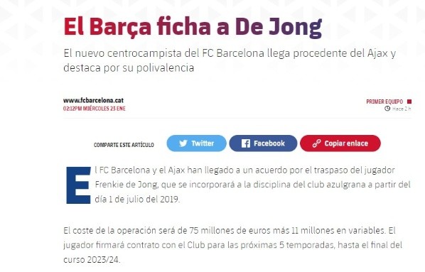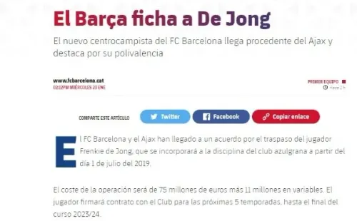 Es oficial la llegada de Frenkiede Jong, por una suma multimillonario: 75 millones de euros más 11 millones en variables.