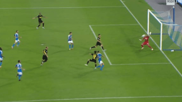 Sobre el minuto 40 del periodo inicial, Ospina pegó un pelotazo que terminó conduciendo Lorenzo Insigne por algunos segundos. Inmediatamente, el extremo izquierdo le cruzólabola aDries Mertens, quien pudo convertir su remate en el empate del partido.