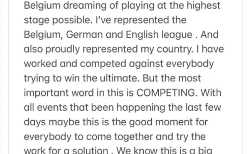 En las redes sociales, publicó una emotiva carta: “Este hombre salió de un pueblito de Bélgica y soñaba con jugar en el mejor escenario posible. He representado a las ligas belga, alemana e inglesa. Y también representé con orgullo a mi país. He trabajado y competido contra todos tratando de ganar lo máximo.Pero la palabra más importante en esto es COMPETIR”, comenzó diciendo.