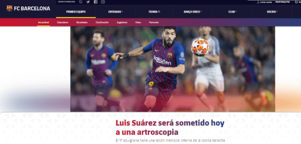 El club comunicó hoy que Luis Suárez deberá someterse a una artroscopía a casusa de una lesión en el menisco interno de su rodilla derecha.