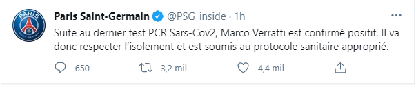 “Después de la última prueba de PCR Sars-Cov2, Marco Verratti se confirma positivo. Por lo tanto, respetará el aislamiento y está sujeto al protocolo de salud adecuado“, dice el breve comunicado que emitió el conjunto francés a tráves de su cuenta oficial de Twitter.
