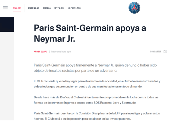 Primero que nada, dejando en claro que el club “apoya firmemente a Neymar Jr., quien denunció haber sido objeto de insultos racistas por parte de un adversario”.