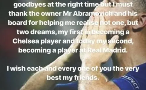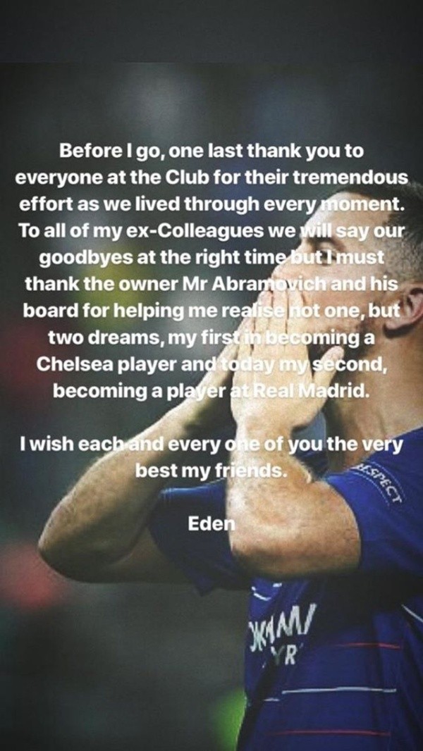 Antes de irme, un último agradecimiento a todos en el club por su tremendo esfuerzo como lo vivimos a través de cada momento. A todos mis ex colegas vamos a decir nuestras despedidas en el momento adecuado, pero debo dar las gracias al dueño el Sr.Abramovichy su junta por ayudarme a darme cuenta de no uno, sino dos sueños, mi primero en convertirse en un jugador delChelseay hoy mi segundo, Convertirse en jugador en elReal Madrid.
