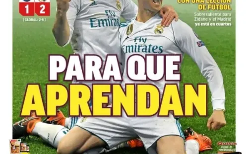 El diario Marca tiene uno de los titulares más contundentes al decir”Para que aprendan” y que el Madrid “pone en si sitio al PSG con una lección de fútbol”.