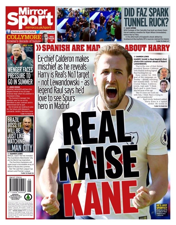 La prensa de Inglaterra puso en portada titulares asegurando que el goleador del Tottenham Harry Kane debe irse al Real Madrid, en base a declaraciones de un ex presidente del club Merengue.