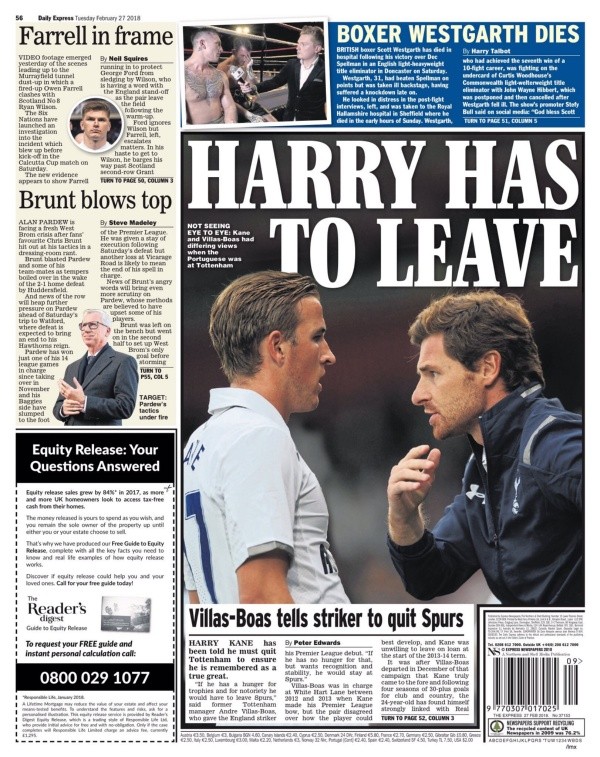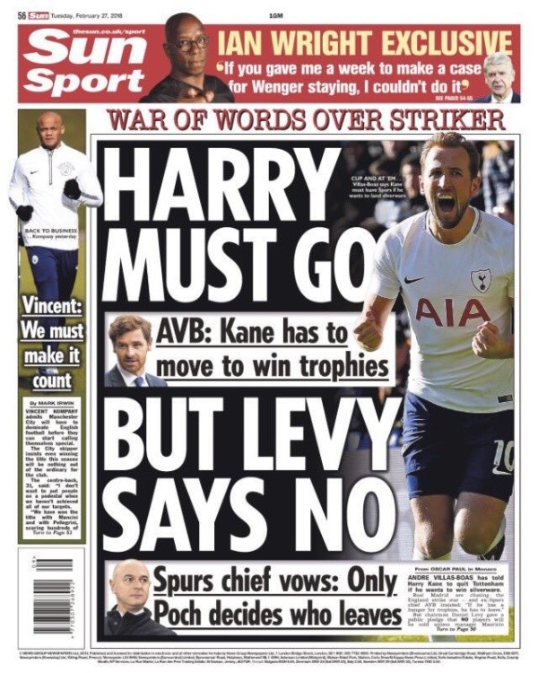 “Sólo Pochettino decide quién se va”, asegura The Sun en su portada. En el titular figura:“Harry debe irse (por Villas-Boas) pero Levy dice que no”.