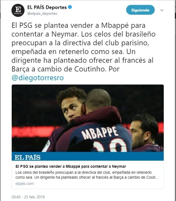 La publicación asegura que uno de los dirigentes del club del París hará lo que sea necesario para retener a la estrella brasileña, incluso ofrecer al Barcelona a Mbappé, que costó 180 millones de euros, a cambio de Coutinho.