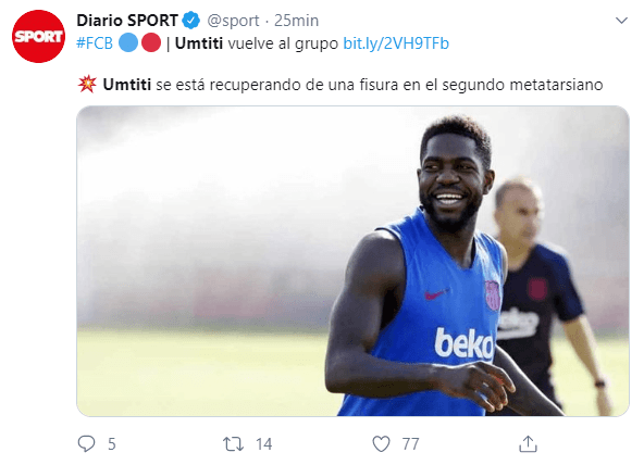 Umtiti se está recuperando de unafisura en el segundo metatarsiano, lesión que fue comunicada por el club el pasado 13 de septiembre y por la que debía estar fuera de los terrenos de juego entre cinco y seis semanas.