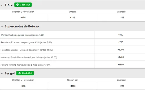 Mientras que Liverpool (flamante campeón) le tocará visitar al Brighton, que también quiere escalar en la tabla de posiciones de quienes se encuentra en la zona de descenso. Con betway te contamos que el favorito para ganar es Liverpool que paga -182, mientras que los momios para el Brighton son de +475. El empate paga +333.