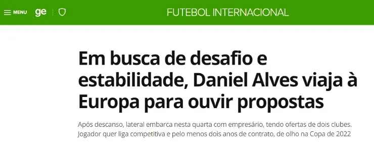 Según detalló Globoesporte, el ex hombre del Barcelona se habría trasladado al Viejo Continente con el fin de dialogar con diversas instituciones para definir su futuro. Si bien no hay nada oficial, se especula que dos de los clubes con los cuales Alves está en plenas tratativas son el Tottenham y el Manchester City.