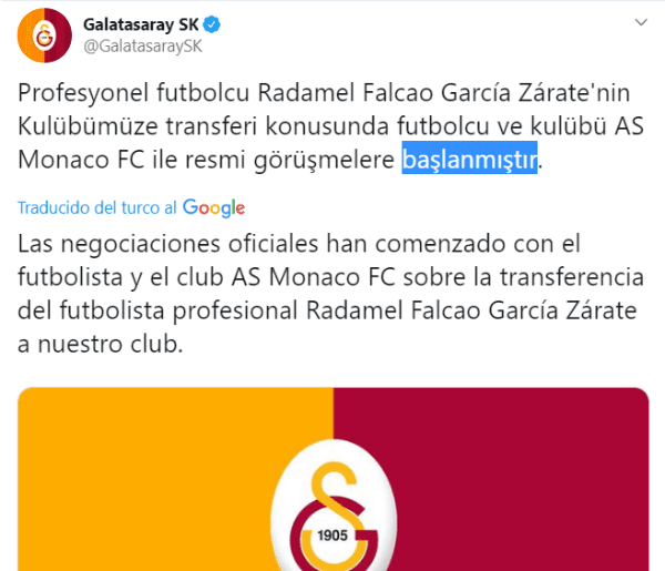 Minutos después de ese mensaje, Galatasaray volvió a publicar en sus redes y el anuncio sobre Falcao llegó. El equipo turco ha iniciado las negociaciones oficiales y formales con Mónaco para sacar a Radamel de Francia y que llegue en las próximas horas al fútbol turco.