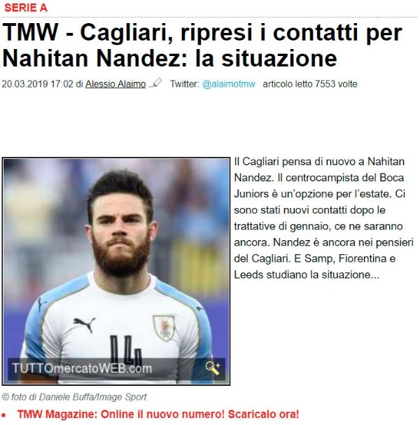 Se trata de Nahitan Nández, quien según HITC,TuttoMercatoeInfobaeestá en agenda del club que dirige elLoco.