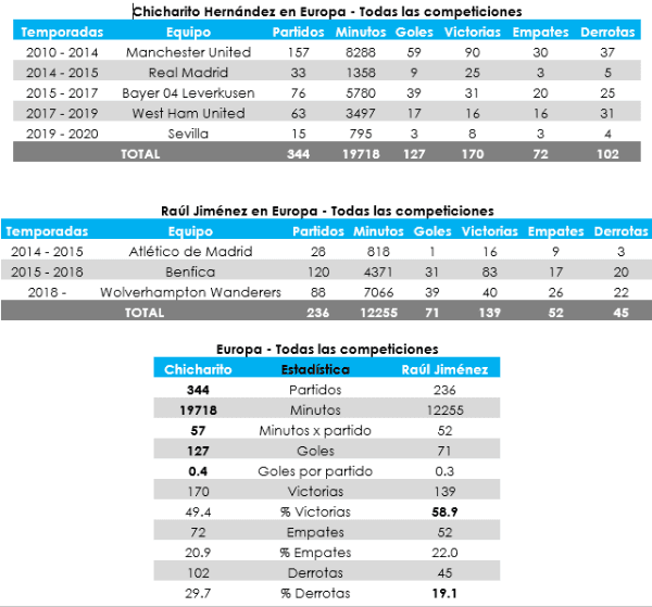 Además, Hernández presentó una mayor continuidad en el futbol de alto nivel y jugó en equipos de élite mundial, a diferencia de Jiménez: disputó 344 encuentros contra 236de su adversarioen el continente mencionado.