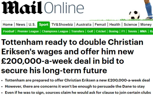 Aparentemente, Eriksen, que hoy en día gana una suma aproximada a los 4,5 millones de forma anual, pasaría a recaudar más de 11.000.000de euros.
