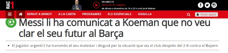 “Messi le ha comunicado a Koeman que no ve claro su futuro en el Barça“, comunicó el medio catalán.