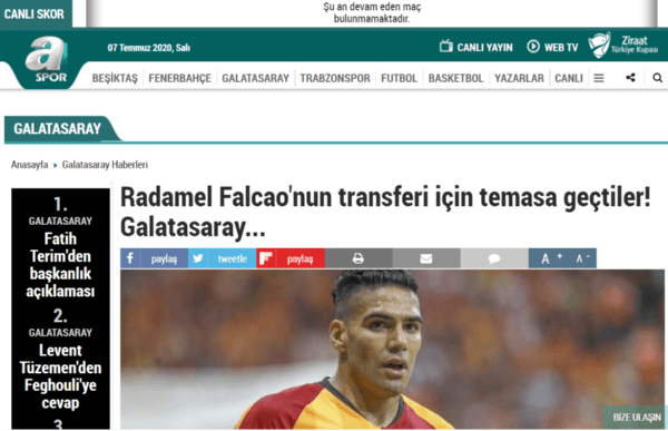 “Falcao está considerando seriamente la oferta de Al Wahday quiere hacer la última transferencia de su carrera a un buen precio”, cita el portalAspor, que también señala que Galatasaray no estaría dispuesto a dejarlo ir por un bajo costo así haya llegado casi gratis en el verano anterior.