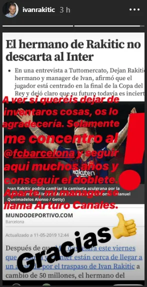 Prácticamente confirmando que su anhelo es continuar en el elenco Blaugrana, el mediocampista agregó: “Solamente me concentro en el FC Barcelona y seguir aquí muchos años y conseguir el doblete. Aparte, mi manáger se llama Arturo Canales”.