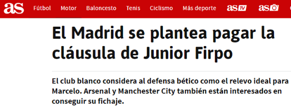 El periódico informó que el club Merengue estaría interesado en hacerse con los servicios de Junior, uno de los jugadores más importantes del Betis, que actualmente cuenta con una cláusula de 50 millones, un gran número para dicho club.