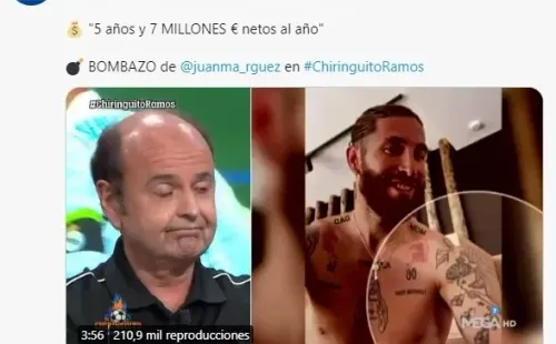 Juanma Rodríguez, tertuliano del Chiringuito de Josep Pedrerol y sumamente identificado con Real Madrid afirmó anoche: “Sergio Ramos tiene una oferta de un equipo españolde primera división. Tienen un sus manos una oferta por 5 años, a razón de una suma de 7 millones netos por campaña y la promesa de que cuando deje el fútbol seguirá ligado al club. Ese club es el Sevilla. Si Ramos se va es porque quiere ganar un pulso, pero perderá la batalla por la ilusión y el futuro”.