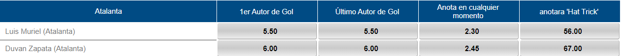 Si Murielllega a hacer un gol en cualquier momento del partido, se paga 2,3 veces lo apostado y si hace el primer o el último gol se le gará 5,5 veces lo que invierta. Mientras, con Duván, si marca durante el encuentro se pagará 2,4, mientras que si marcaprimer o el último gol se le ganará6veces.