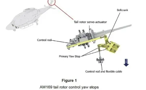 “El sistema del rotor de la cola se inspeccionó por primera vez en el lugar del accidente. Se identificó que el mecanismo de la palanca de entrada no estaba conectado al eje del control. El pasador, los espaciadores y uno de los cojinetes de localización faltaban en la palanca. La tuerca de bloqueo y el soporte del pasador se encontraron sueltos en el carenado del rotor de cola y se unieron entre sí (deben ser componentes separados”, indicó el informe.