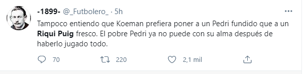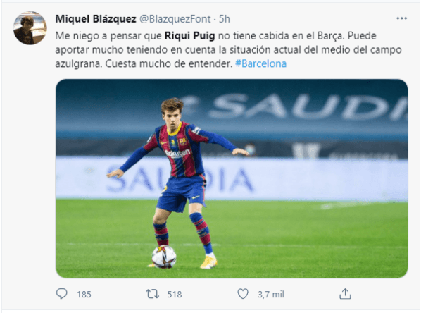 Uno de los jugadores que no jugaron y se transformó en tendencia en Twitter por el pedido de los hinchas del Barcelona fueRiqui Puig, quien de la mano de Koeman ha tenido una temporada bastante irregular. La empezó con la palabra del técnico diciéndole que no iba a tener minutos y aconsejándole irse a préstamo a jugar a principio de año y a ahora tener menos minutos que antes.