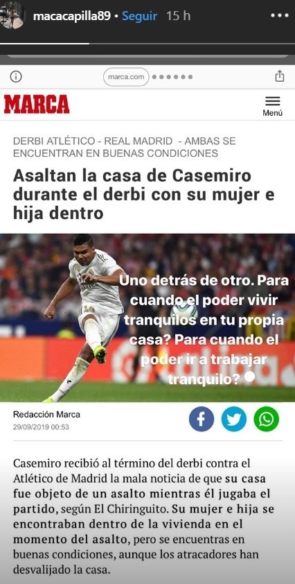 Su esposa e hija estaban dentro, pero por suerte no resultaron heridas. Fue la mujer de Lucas Vázquez quien se manifestó muy enojada en las redes.