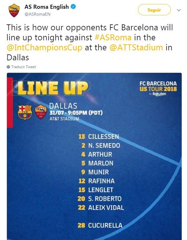 This is how our opponents FC Barcelona will line up tonight against #ASRoma in the @IntChampionsCup at the @ATTStadium in Dallas pic.twitter.com/ommJHt0wVs