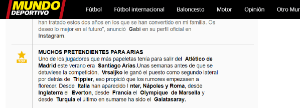 Mientras que finaliza la temporada, Santiago Arias será alternativa por la banda derecha,mientras tanto llegan rumores de que varios equipos lo quieren.Mundo Deportivo destacó que hay clubes de Francia, Italia, Inglaterra y Turquía preguntando por el colombiano.