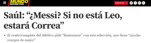 “Al final lo que nos interesa es que cualquier compañero de profesión estécon salud y no tenga lesiones. Argentina tiene un gran equipo, con grandes jugadores,si no está Messi estará Correaque te la puede liar en cualquier momento. Hay que tener mucho cuidado con cualquier de sus jugadores”, aseguró el futbolista.